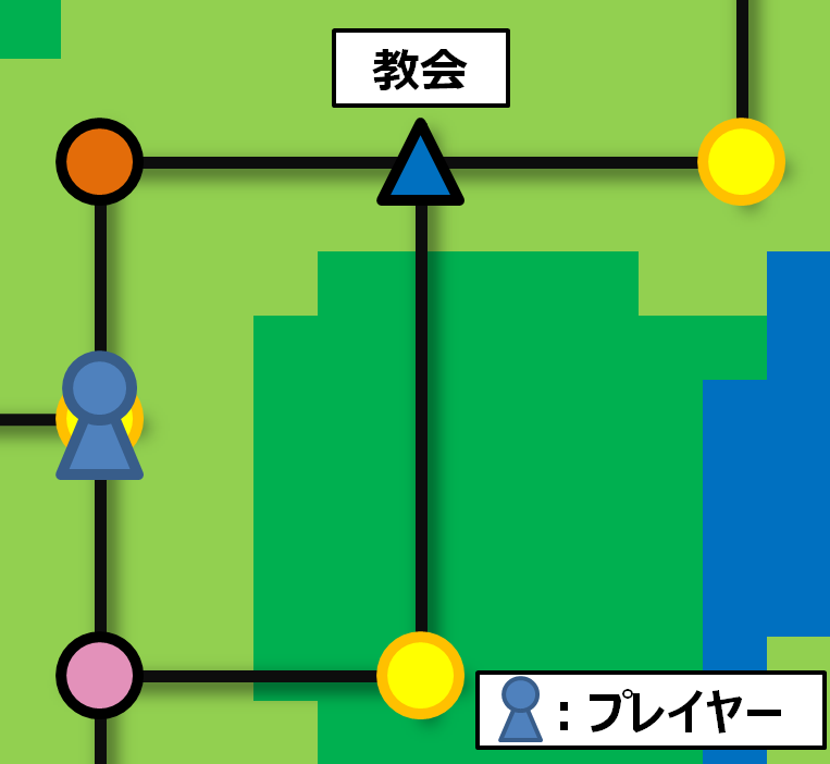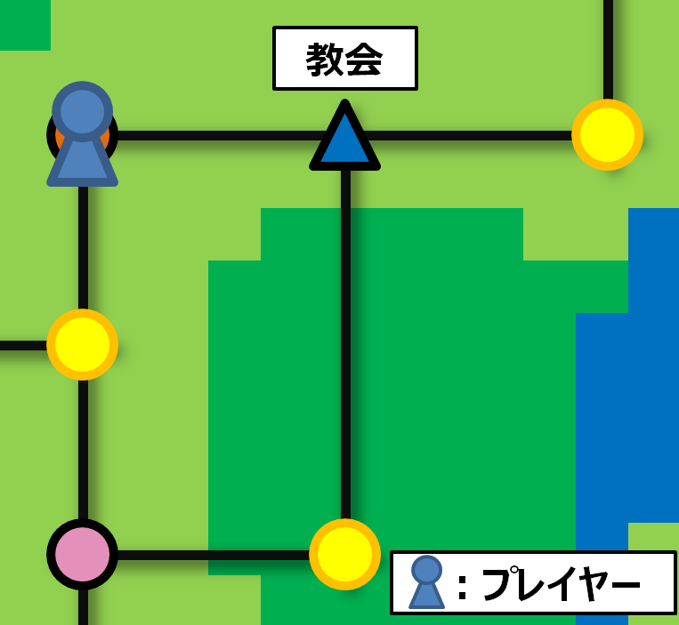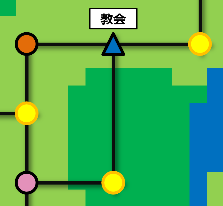 教会周辺ののマス配置 左下の図の例で行くと、上から2マスで抜けるルートと、下から3マスで抜けるルートの2種類のルートになります。